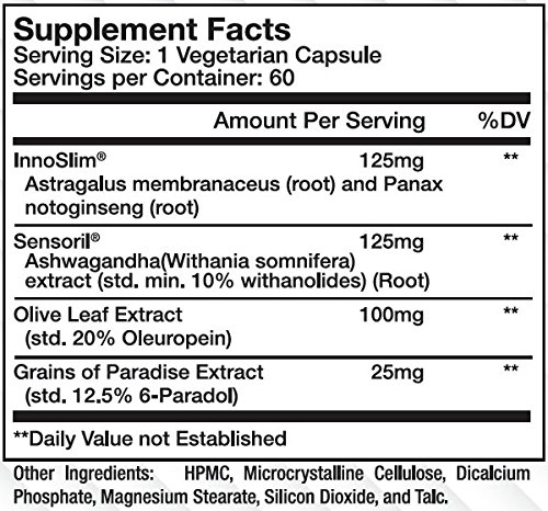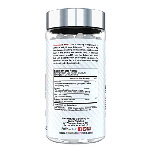 -. Feature : CAFFEINE FREE APPETITE SUPPRESSANT: InferNO is the supplement industryâ€TMs premier non-stimulant thermogenic fat burner supplement. Featuring 2 patented ingredients, grains of paradise and olive leaf extract, InferNO will help suppress your appetite, burn midsection fat, and boost your metabolism. InferNO can be enjoyed on itâ€TMs own, or, stacked with diet pills with caffeine. / MIDSECTION // BELLY FAT BURNER: Using the patented and highly-researched Sensoril Ashwagandha, InferNO features an ingredient that clinically researched benefits in helping reduce midsection fat. This is due to Sensorilâ€TMs ability to normalize healthy cortisol levels. This makes InferNO the ideal midsection fat burner since it helps normalize those levels and support stubborn belly fat loss. / REDUCE STRESS RELATED EATING: Another benefit of Sensoril Ashwagandha is itâ€TMs clinically validated ability to help control stress related eating*. Perfect for individuals who turn to sugary snacks or carbs when stressed, InferNO can help mitigate the need to reach for these types of foods that can seriously derail your weight-loss efforts. / HEALTHY WEIGHT LOSS PILLS: Using all-natural weight loss ingredients found in nature, InferNO provides a more healthy weight loss experience that is void of any harmful synthetics. Not to mention, the lack of caffeine or any stimulants makes this weight loss product great for those looking to avoid excessive stimulant intake. / BOOST METABOLISM: With the inclusion of Grains of Paradise, InferNO features an ingredients scientifically shown to be a metabolism booster and help your body burn more calories - both during exercise and at rest.