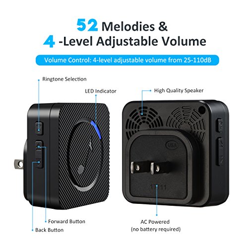 【52 Melodies with 4-Level of Adjustable Volume】: The wireless doorbell offers a wide selection of 52 chimes for your personal taste, including Christmas song (jingle bells) and more. 4-level of volume range from 25dB to 110dB.