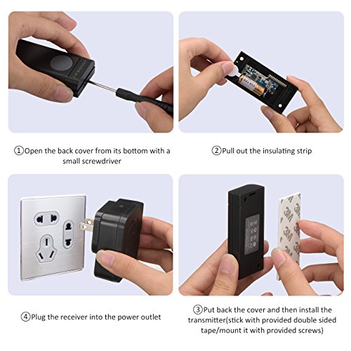 【Easy Installation and IP44 Waterproof Transmitter】: Just plug the receiver into a wall outlet, install the push button with provided double sided tape or screw it to the wall (screws are included).The push button is rated IP44 and weatherproof for outdoor use.