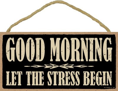 (SJT94237) Good morning. Let the stress begin. 5" x 10" wood sign plaque