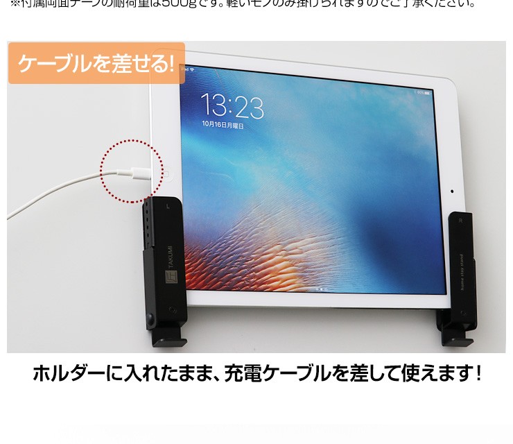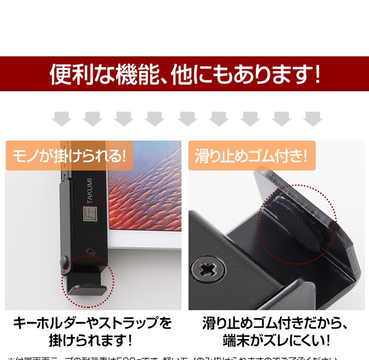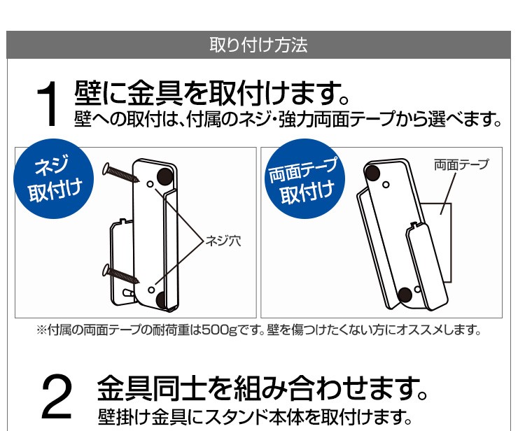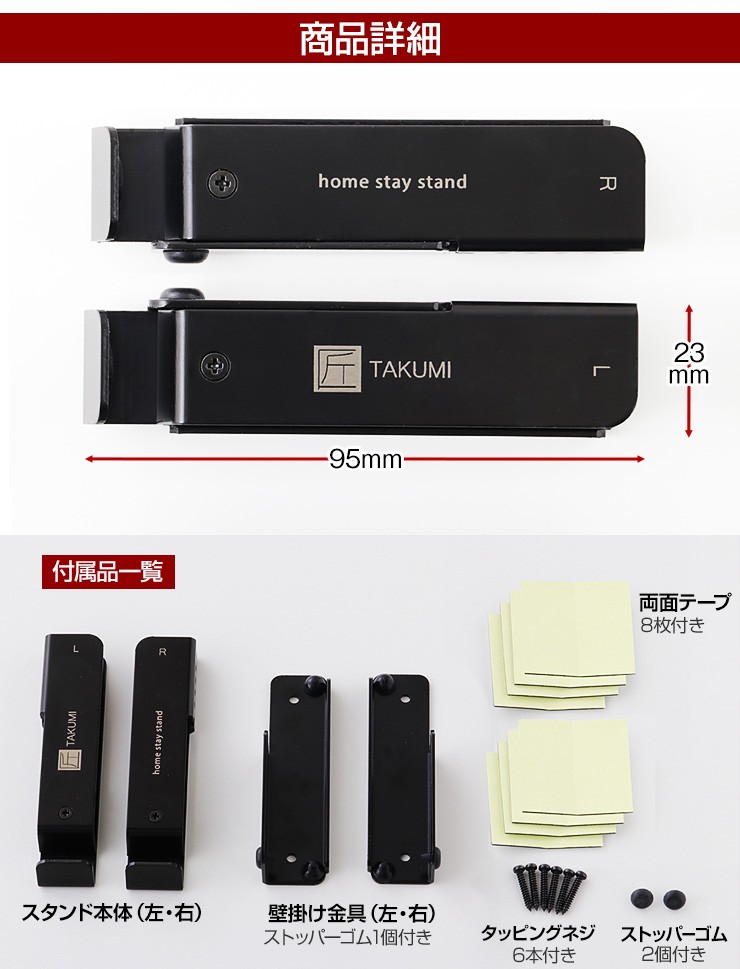 | 付属品 | スタンド本体右×1個 スタンド本体左×1個 壁掛け金具右×1個(ストッパーゴム1個付き) 壁掛け金具左×1個(ストッパーゴム1個付き) タッピングネジ×4本 タッピングネジの予備×2本 ストッパーゴムの予備×2個 両面テープ×8枚 |