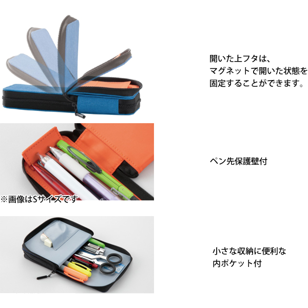 ●カバンの小さな隙間にも収まるスペース効率型ペンケース。上フタがパタリと開いて中身がよく見える