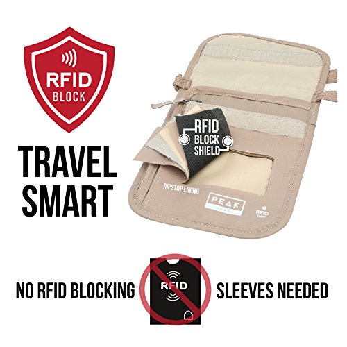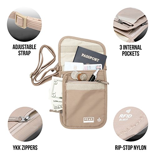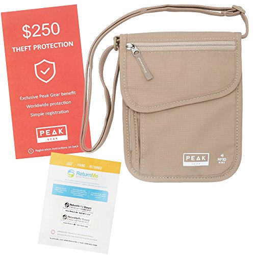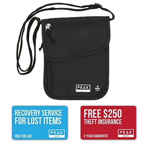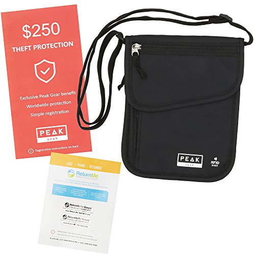 -210D Ripstop Nylon - Lightweight and durable to last you for years of travel -Exclusive ComfortSoft Strap -The softest and most comfortable strap on any neck wallet -Breathable Mesh Backing - Stays comfortable for all day use and in warm climates -YKK Zippers - The industry's highest quality zipper for smooth, jam-free function Includes 2 Global Recovery Decals Peak Gear has partnered with ReturnMe, the world's largest Lost Found company to offer you a lifetime global recovery service for your valuables. Two recovery tags are included with each purchase. Simply activate the personalized ID and attach to your phone, passport, camera, e-reader, etc. If the protected items are ever lost and found, ReturnMe's 24/7 call center will help get the items back to your door, from anywhere in the world. There is NO additional cost, ever. Security First Peak Gear will reimburse you if items are ever stolen from this product. Trust a company that stands behind its products. True RFID Block Protection See for yourself how our neck wallet is built with layers of RFID blocking material right in the fabric. Keep all of your valuables protected, without adding bulk. The Peak Gear Promise You won't be disappointed. Our USA-based customer care team will make sure that you are happy with your Peak Gear product. 0