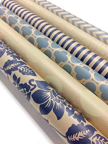Kraft Blue and Cream Wrapping Paper Set - 6 Rolls - Multiple Patterns - 30" x 120" per Roll