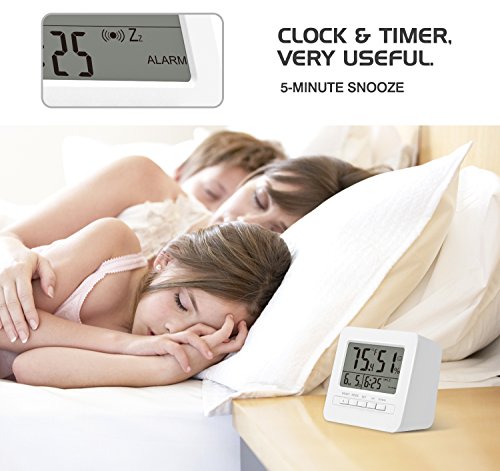 - ADVANCED FEATURES - Indoor temperature display (C or F) / humidity display, 12/24 hour format, countdown timer (from 0:00 to 23 hours 59 minutes). Alarm clock with snooze function.