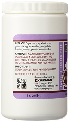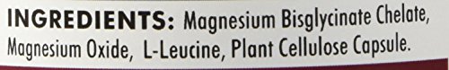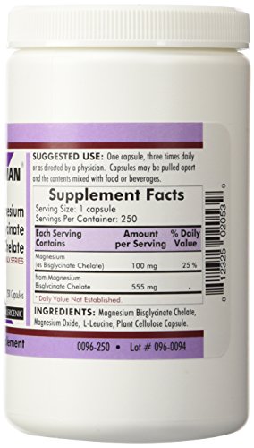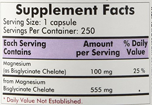 Magnesium Bisglycinate Chelate 250 caps Dietary Supplement Suggested Use: One capsule three times daily or as directed by a physician. Capsules may be pulled apart and contents mixed with food or beverages. Supplement Facts: Serving size: 1 capsule Servings per container: 250 Amount per serving: Magnesium (as Bisglycinate Chelate) 100 mg from: Magnesium Bisglycinate Chelate 555 mg Ingredients: Magnesium Bisglycinate Chelate Magnesium Oxide L-Leucine Plant Cellulose Capsule. Free of: Sugar starch soy wheat casein gluten milk egg preservatives yeast gelatin flavorings colorings peanuts tree nuts or fish. Important: Store in a cool dry place and tightly capped. Keep out of the reach of children. Caution: Magnesium supplements can cause changes in stool consistency and bowel habits. If this occurs discontinue use and discuss this matter with your physician.