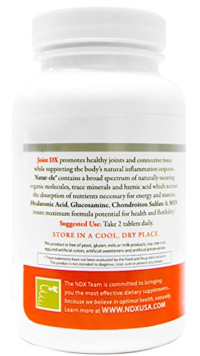 Joint DX promotes healthy joints and connective tissue while supporting the body's natural inflammation response. This unique formula combines MSM, Glucosamine, Chondroitin and Natur-ele® (a patented mineral complex). Joint DX supports the body's antioxidant defense and may reduce daily joint aches. Vitamin C, Glucosamine, Chondroitin Sulfate and MSM are important building blocks for healthy joints. Hyaluronic Acid is a component of joint fluid and provides cushioning and lubrication for joint cartilage. Natur-ele® is a patented organic chelating complex that contains a broad spectrum of naturally occurring organic minerals, trace minerals and fulvic acid. It contains all essential amino acids and over 77 trace minerals in their ionic form for immediate uptake. The organic carbon contained in Natur-ele® provides the nutritional building blocks for the whole body to promote an effective digestive process and build a strong immune system. With over 10 years of University research and field trials, Natur-ele® has been proven to support joint health, reduce joint aches and joint discomfort. In scientific studies it has been shown to help build a healthy blood system, influence joint flexibility and increase the body's inflammation response.Feature