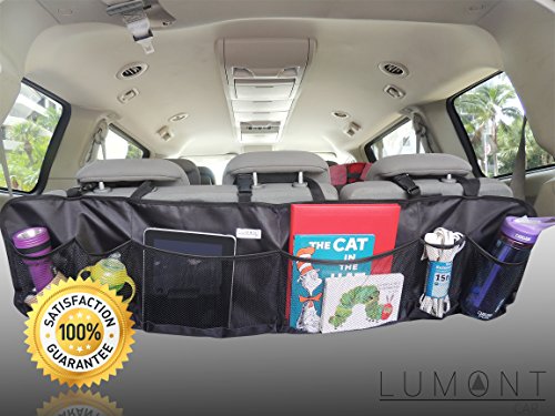 Lumont Trunk Organizer Deluxe Auto Car with 3 Headrest Straps -Interior Removable Storage Mesh Backseat- Multipurpose and Foldable Six Pocket Cargo Net Organizers- Black