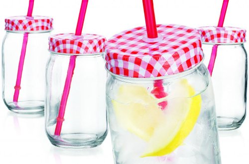 Product Description Set of Four (4) glass Mason Jar Beverage Cups with Red Gingham metal lids straws. Dimensions: 3.3" diameter x 5.3 High, Capacity 15-oz each. 0