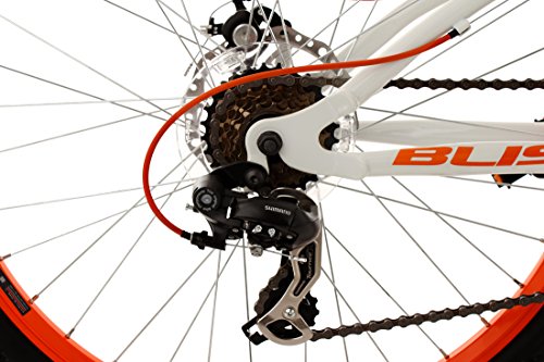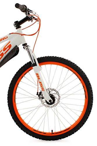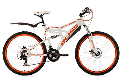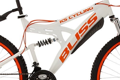 Stürzen Sie sich ins Abenteuer Mountainbiking: mit dem BLISS von KS Cycling! Das vollgefederte 26"-Mountainbike kommt ganz in Weiß mit schwarzen Anbauteilen und Felgen, Decals und Kabelzügen in knalligem Orange. Auch Spritzschutz und Sattel sind aufs Design voll abgestimmt. Diese Hammer-Optik steht überall im Mittelpunkt!
