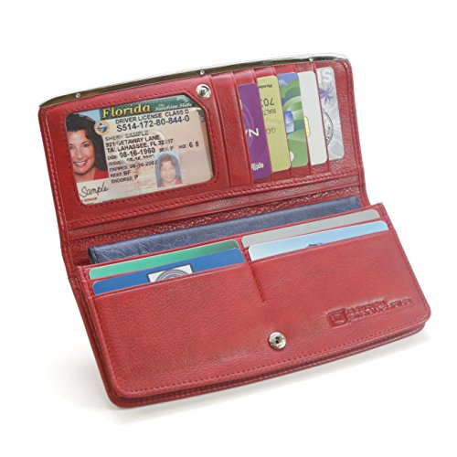 -. Feature : STAY ORGANIZED. Room for everything you need while remaining slim and elegant. This wallet features ten card slots, including one clear ID window with thumbhole. It also has three full length pockets, one of which is gusseted in order to accommodate a checkbook register. An interior zipper compartment will store coins. Closes securely with an elegant snap closure. / SLEEK AND STYLISH. This slim ladies clutch is the perfect solution for an all-around wallet. The slim design allows you to fit the wallet in a wide variety of purses, yet it is elegant enough to carry out all on its own. Doesn't it make sense to keep all forms of payment together? Forget about digging around in your purse for your checkbook. Simply pull out your wallet, and voila! / GENUINE LEATHER. This top quality checkbook wallet is made of super soft and supple genuine leather and features an elegant metal trim along the leading edge. Knowing your credentials are electronically secured, this wallet looks and feels great, making you look and feel great too! / EVERY SLOT SHIELDED to protect your Credit Card, Debit Card, Enhanced Driver's License, Transit Card, Hotel Room Key, Passport Card, etc. transmitting at 13.56 Mhz and higher. Designed with top security in mind. As with all ID Stronghold wallets, every slot, ID window, billfold, and compartment is individually shielded, so your information is protected, no matter where you place your RFID cards, even when the wallet is open. This feature is not found in most RFID wallets. / PERFECT GIFT! Each wallet comes with its own original ID Stronghold GIFT BOX so you can buy one for yourself, and one for a friend. Looking for something different? Just search for ID Stronghold at the top of Amazon to find all of our styles. OUR PROMISE - If, for any reason, you do not love your Brand New Wallet, we will refund 100% within 30 days. No questions asked. Buy now RISK-FREE. Product Dimensions: 7.375 x 3.5 x .75 inches • Product Weight: 4.31 ounces
