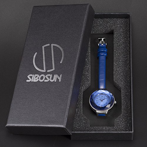 SIBOSUN Wrist Watch Lady Women Girl Quartz Luxury Blue Glass Leather Strap Band Rose Gold Case Analog