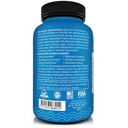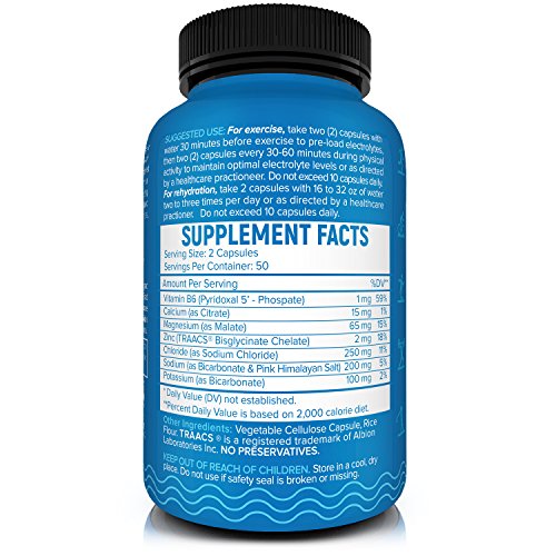 -. Binding : Health and Beauty -. Brand : Total Hydration -. EAN : 0689354011377 -. Feature : Rated "#1 Electrolyte Replacement Supplement for Athletes and Dehydration" by The Health Beat ★Developed by a PhD and former Triathlete ★ Vegan ★ Non-GMO ★ Zero Calories ★ Made in USA ★ Gluten Free ★ Does NOT Contain Soy, Gelatin, Egg, Dairy or Caffeine ★ No Additives or Fillers / Improves Endurance & Reduce Fatigue ★ Increases Performance & Recovery ★ Reduces Muscle Cramps and Soreness ★ Better Control of Oxygen Transportation Hormone Health, Immunity and Focus ★ Improves Hydration / Science-backed formula with optimal electrolyte ratios to replace electrolytes lost during sweat and required for recovery & rehydration ★Superior forms of Sodium, Magnesium, Potassium, Chloride, Zinc and Vitamin B6 For Maximum Absorption ★ Pink Himalayan Salt contains approximately 84 Natural Trace Minerals / Full-electrolyte profiled with highest quality bicarbonate forms of sodium and potassium electrolytes to reduce fatigue, increase power and optimize endurance (most competitors use inferior / cheaper forms) ★ A higher intake of magnesium in the form of malate to reduce the incidence of muscle cramps and muscle soreness while enhancing energy return ★Convenient vegetarian capsule delivery / Athlete Uses: Runners, Cyclists, Swimmers, Cross-Fit, Yoga, Professional and Collegiate Athletes, Football, Basketball, Golf ★ Dehydration Uses: Muscle Cramping, Heat Exhaustion, Outdoor Jobs, Alcohol Consumption, International Flights and Illness, the Ketogenic Diet and Chemotherapy. -. IsAdultProduct : 0 -. Label : Total Hydration -. Manufacturer : Total Hydration -. ProductGroup : Health and Beauty -. ProductTypeName : HEALTH_PERSONAL_CARE -. Publisher : Total Hydration -. Size : 100 Vegi-Capsules -. Studio : Total Hydration -. Title : TOTAL HYDRATION Natural Himalayan Salt Electrolyte Replacement Capsules - #1 Ranked - Recovery from Endurance Sports, Heat, or Hangovers - Restores Energy, Reduces Cramps - 100 pills, USA Made -. UPC : 689354011377