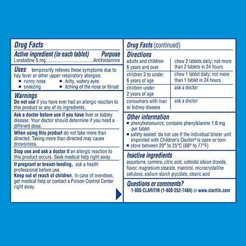 Children's Claritin Chewable Tablets, in bubblegum flavor, provides effective, 24-hour allergy relief of your child’s allergy symptoms, like sneezing, runny nose, and itchy, watery eyes. Antihistamine. For children ages 2 . Each tablet contains 5mg of loratadine. 0 |