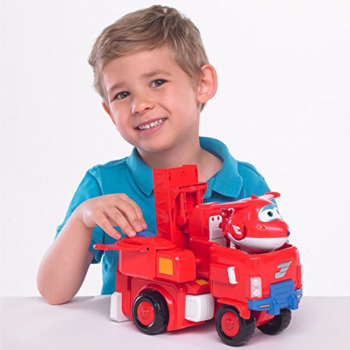 Time for a super upgrade! At over 14 inches tall, this impressive Jett’s Super Robot Suit transforms from a free-wheeling vehicle to a free-standing figure that can conquer the toughest problems! Transforms from vehicle to bot in 8 easy steps! Lights up and says 6 catch phrases from the show with an easy press of a button. With a real working ladder and wheels, this Jett’s Super Robot Suit also includes a Jett 5” Transforming figure that can change from plane to bot! The Jett 5” Transforming Figure also transforms from plane to bot and fits in the cab in both vehicle and bot mode. Explore the fun and exciting world with other Super Wings characters! All 5” transforming figures work with Jett’s Super Robot Suit (sold separately). Jett’s Super Robot Suit is for Super Wings fans ages 3+. (Battery info 2 x AAA)Feature