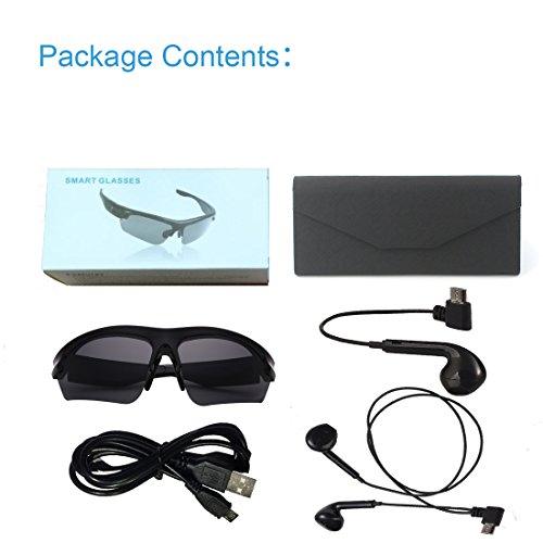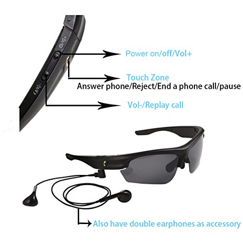 -. Feature : Touch Slipping & Super light only 28g Bluetooth Sunglasses,When you wear long time ,you nose will not feel tired And Wireless listen to stereo music, set aside to answer the call automatically converted. Enjoy music in the sun without disturbance and protect your eyes and eyesight. Hands free answer call when you are driving or riding a bicycle.It can pair with devices up to 10 meters away / Enjoy a long time music, Built-in rechargeable lithium ion batteries with up to 10 days standby and 7~8 hours working time. / The Bluetooth Sunglasses perfectly combine Polarized Sunglasses with Bluetooth Headphone. Featured Bluetooth 4.1 giving these Wireless Earbuds unparalleled stereo sound quality. It supports answering phone & MP3 player & call back the last call. Perfect summer time accessory of driving and outdoor activities, such as cycling/ fishing/ travelling/ climbing/ golf / Luxury & Foldable Glasses bag ,it is very convenient to fold the bag and put into your handbag, when you are use the Bluetooth Sunglasses / 5.Sincerely Warranty: The experience from customer will be our most precious Wealth, We are ready to respond within 24 hours, 30 days money back guarantee and lifetime technical support.[Remove the Screen Protection Film of the Lens on BOTH SIDES].