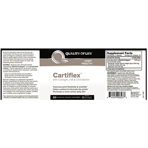 Studio : Quality of Life Labs, Publisher : Quality of Life Labs, Binding : Health and Beauty Product Description Joint Heath With Collagen, HA Chondroitin Improves Joint Flexibility Mobility Helps Cushion Lubricate the Joints Promotes a More Active Daily Life Dietary Supplement Made with BioCell Collagen A joint is the place where two bones are connected. The bones are covered with a layer of slippery cartilage, which enables them to glide against each other seamlessly. Unfortunately, through the normal aging process, the cartilage begins to wear out, impairing easy movement. Cartiflex features two clinically tested ingredients. BioCell Collagen and chondroitin sulfate. These ingredients have been shown in numerous double-blind, placebo-controlled human clinical trials to: 0