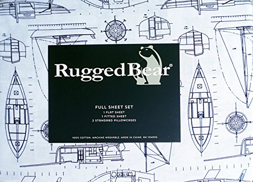 Rugged Bear 4 Piece Full Size Sheet Set Navy Blue Yachts Boats Ships Nautical Plans Design on White