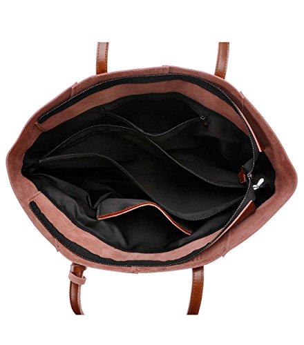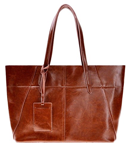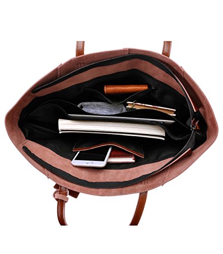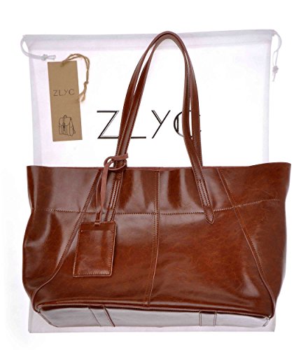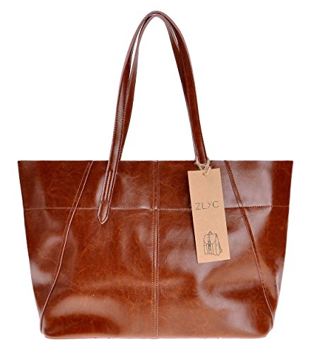 ZLYC Women Cow Split Leather Tote Bag Commuter Shopper Shoulder Bag Large Zippered Handbag, Brown