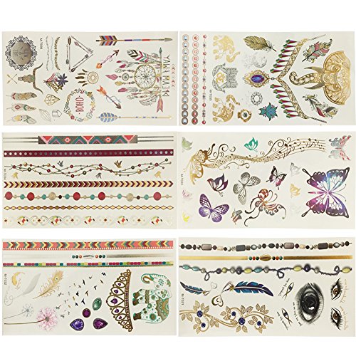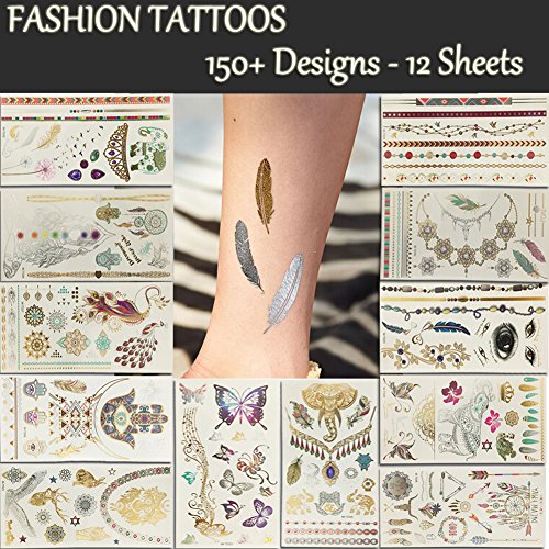 Temporary Tattoos 12 Premium Sheets Metallic Flash - 150+ Shimmer Designs in Gold, Silver, Black - Fake Jewelry Tattoos - Bracelets, Feathers, Wrist & Arm ,...