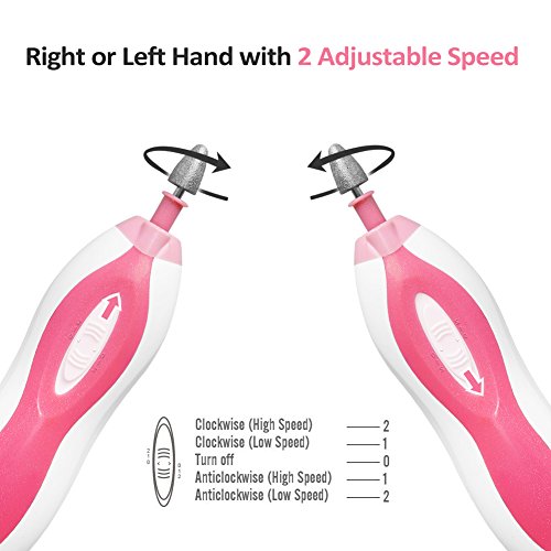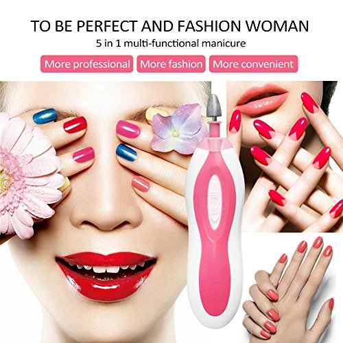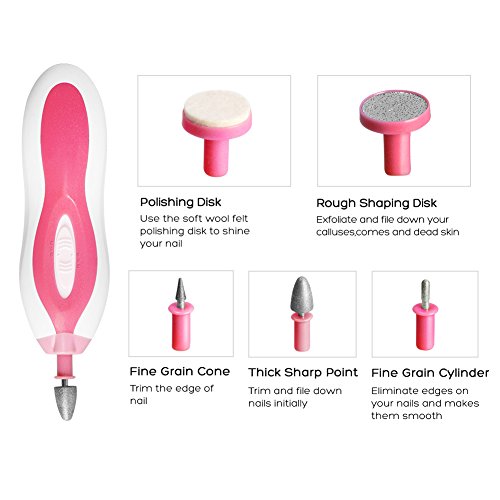 5 Attachments for Different Use: ?Rouch Shaping Disk: Exfoliate and file down your calluses,corns and dead skin ?Fine Grain Cone: Trim the edge of nail ?Thick Sharp Point: Trim and file down nails initially ?Fine Grain Cylinder: Eliminate edges on your nails and makes them smooth ?Polishing Disk: use the soft wool felt polishing disk to shine your nail