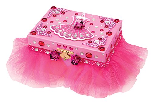 Musical Treasure Box - Decorate a beautiful musical treasure box with a dancing ballerina. Plays "Swan Lake" when the lid is opened. Includes treasure box (5.75in. X 4.25in. X 3.25in. 14.6cm. X 10.8cm. X 8.3cm)), tutu skirt, 5 paper ballerina cut out spapes, 106 sparkly gems, 3 sparkly flowers, glitter glue (0.2oz. / 6g.), 24 adhesive dots and easy instructions. Recommended for children 6 years of age and older.Feature