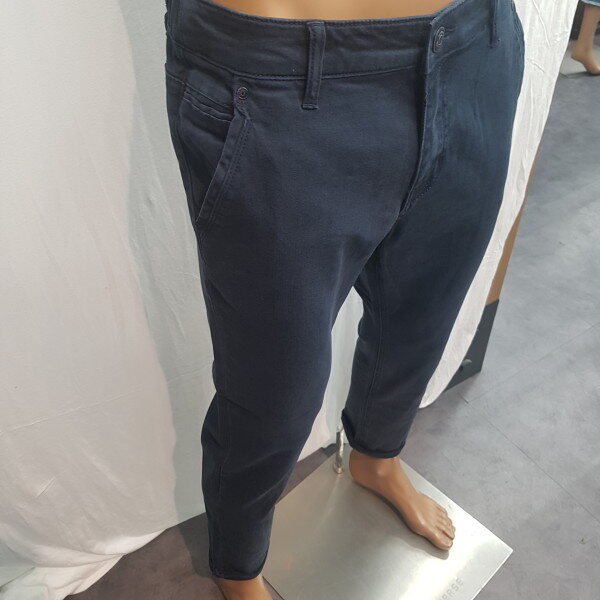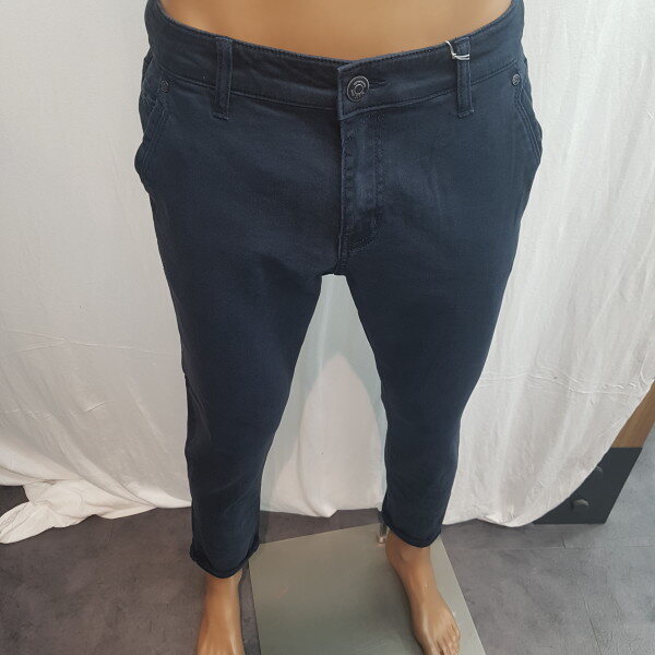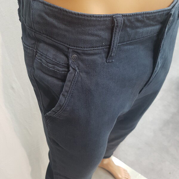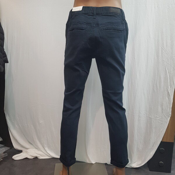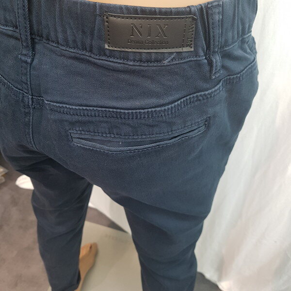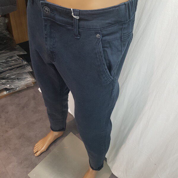 2018년 신상입니다. 네이비 컬러 데님으로 스톤입자를 올려 밋밋한 면바지 느낌을 탈피한 스타일입니다. 뒤허리 부분 밴딩 처리를 하여 보다 편하게 입을 수 있는 제품입니다.