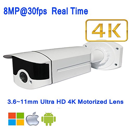 -. Feature : 4K 8MP UHD IP Bullet Camera,H.265/H.264,8.0MP Sony IMX274 Starvis CMOS Sensor,HI3519V DSP / Resoluiton : 4K(3840X2160)@30fps;5MP(2592x1944)@30fps;3MP@30fps / Motorized Lens 3.6~11mm Ultra HD 4K,Remote Control Auto Zoom&Auto Focus Through NVR,PC Software / POE Function,Power Over Ethernet,One Cable Transfer Data&Power;Audio Function: 1CH RCA Input&Output / Plug&Play,Motion Detect&Email Alert,FTP,Remotely View By Free Suppport Android Phone&iPhone,Tablet PC
