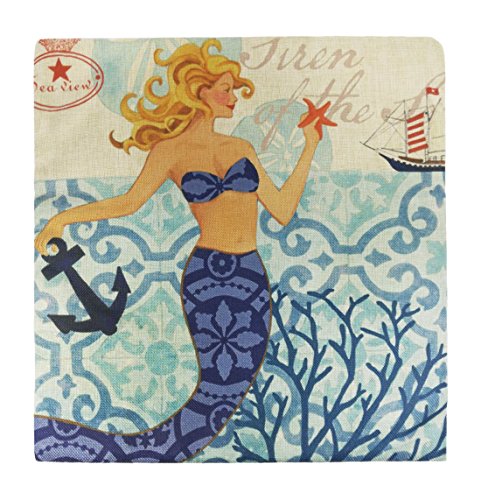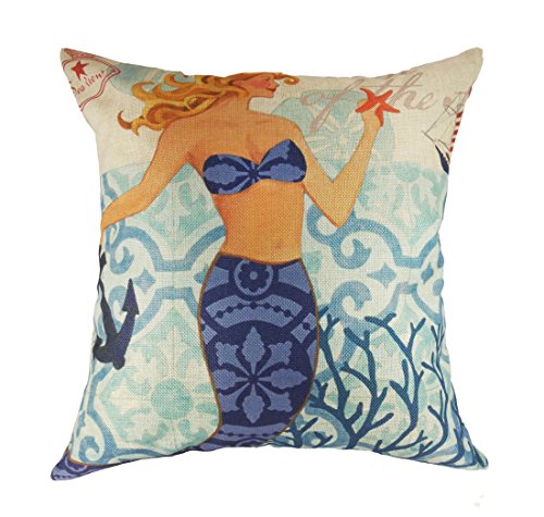 Lolares Home Decor Cotton Linen Square pillow Covers Back Throw Sofa Cushion Cover Pillowcase with Room Decoration Invisible Zipper No Insert Mermaid Pattern - 18"x18"(45x45cm)