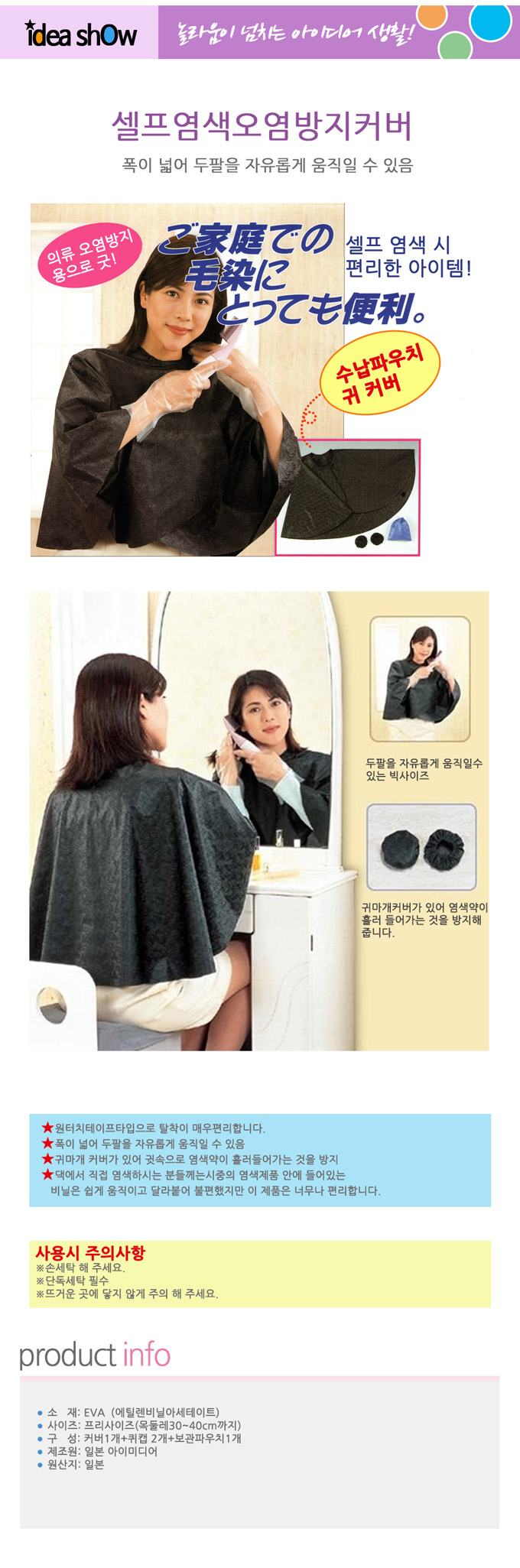 ▷제품설명댁에서 직접 염색하시는 분들께는시중의 염색제품 안에 들어있는 비닐은 쉽게 움직이고 달라붙어 불편했지만 이 제품은 너무나 편리합니다.* 폭이 넓어 두팔을 자유롭게 움직일 수 있음* 귀마개 커버가 있어 귓속으로 염색약이 흘러들어가는 것을 방지▷제품설명* 구성 : 커버 1장+귀마개커버 2장+보관집 * 재질 : EVA(에틸렌비닐아세테이트) * 사이즈 : 프리사이즈(목둘레는 30-40㎝)