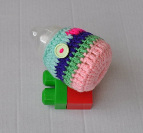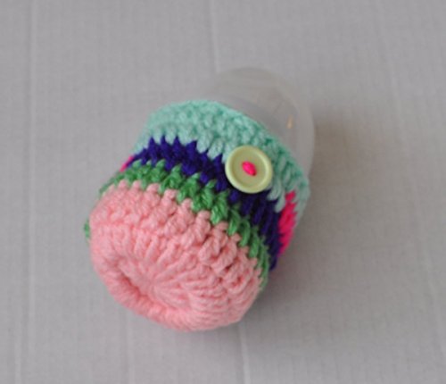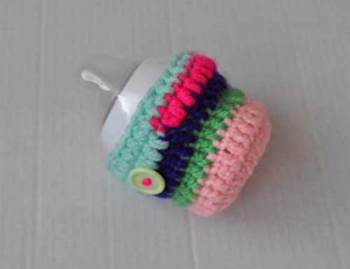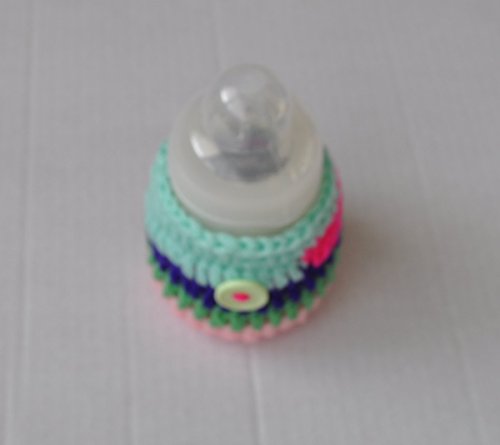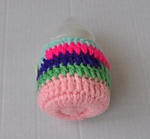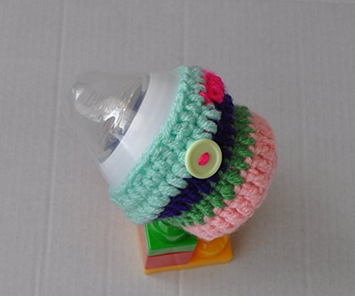 Handmade crochet Multi colour striped cover, embellished with a button. Fits Tommee Tippee 150ml, also fits MAM 130ml, Avent Natural Newborn 125ml, NUK First Choice 150ml infant feeding bottle. Some examples are shown in the photos. This would make a great gift for a newborn baby girl as a babyshower gift or any other occasion. Perfect baby feeding bottle accessory, can be used while out and about or night time feeds. Handmade using soft 100% acrylic yarn and elastic. -has elastic fitted so it grips on to the bottle. - hand washable - machine washable at 40 degrees, lay flat to dry. *Please note that the bottles are not included.*