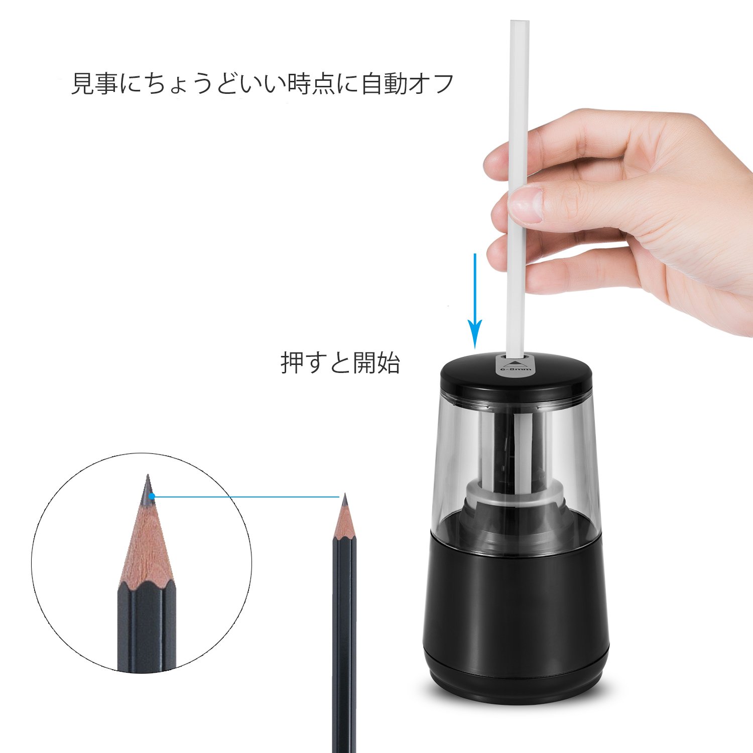 【自動オフ】えんぴつ削りは自動オフ機能があるため、子供に安全です。鉛筆が入り口に入ったとき、軽く押すと開始します。先進的なセンサー技術を利用してちょうどいい時点に止まられます。子供に安全性があるため、鉛筆の破壊や塞ぎを防止することができ、鉛筆を無駄にしないようにします。それに、鉛筆が詰まるや取れないなどの問題がなく、押さないとすぐ取れます。注意:6-8mmの鉛筆だけに適用します。