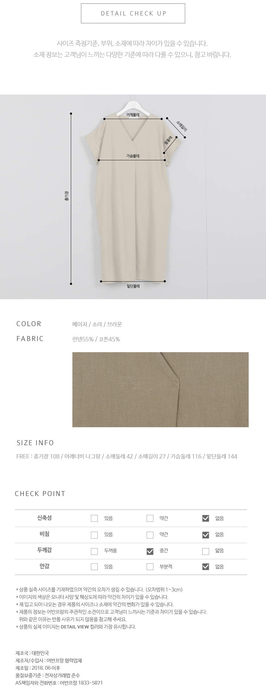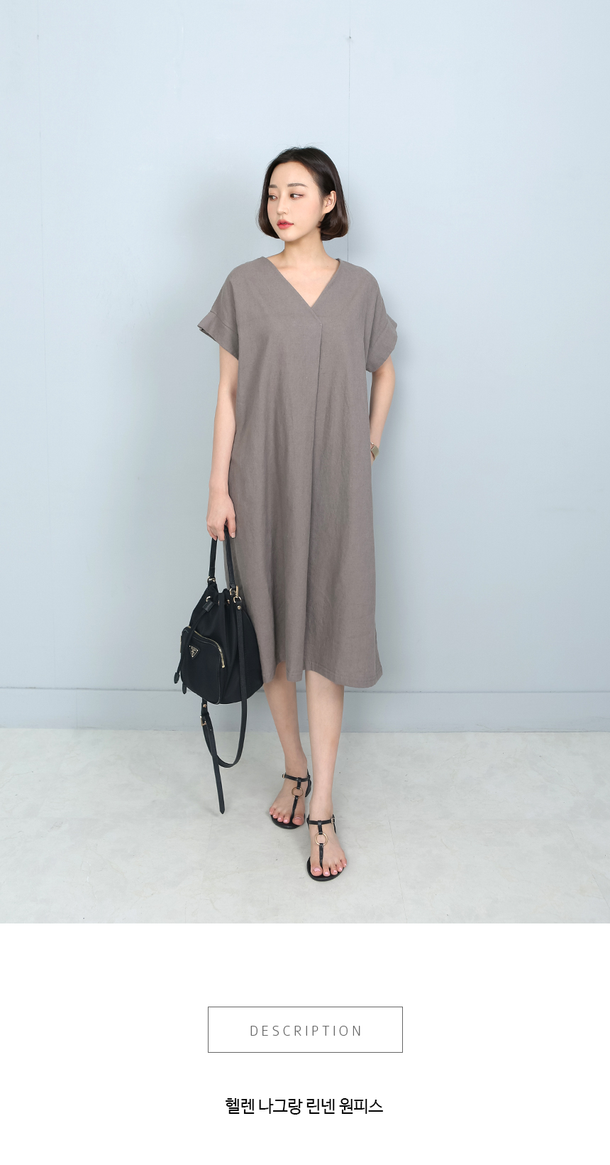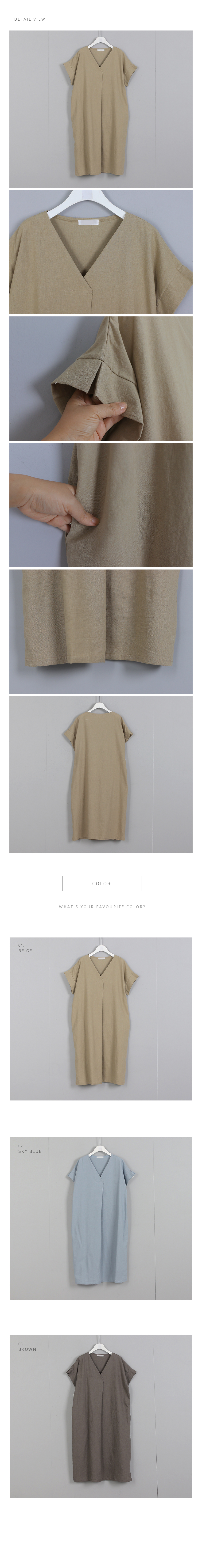 브이넥라인이 목선을 예쁘게 돋보여주는원피스로 나그랑 어깨선에서 이어지는소맷닷이 살짝 살아오르며 깔끔하게마무리되는 디테일이 예쁜 원피스에요앞중심선에서 살짝 겹쳐지며 풍성하게떨어지는 핏으로 상의라인이 예쁘게 돋보이고밑단으로 툭 떨어지는 심플라인이편안하면서도 예쁨가득한 아이템이에요린넨, 코튼 혼방으로 편안하고시원하게 매일 손이갈 여름 원피스랍니다색상은 베이지, 소라, 브라운사이즈는 FREE 44~77