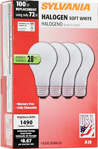Product Description SYLVANIA 52258 - Halogen A19 Light Bulb - 72 Watts - 120 Volt - Produces 1,490 Lumens of Light - 3,000K Color Temperature - Average Life of 1,000 Hours - 4 Pack 0