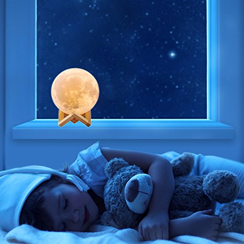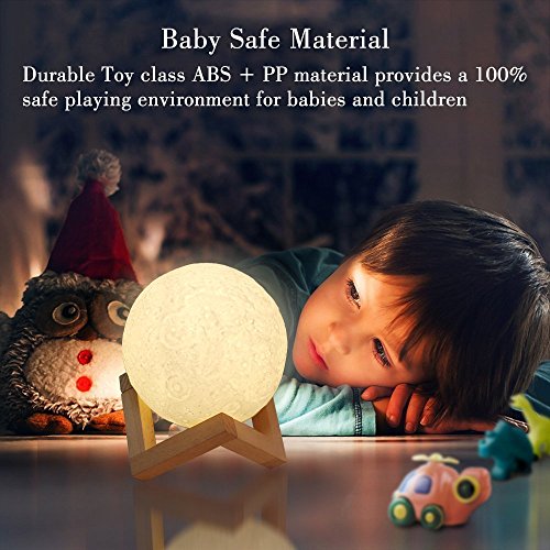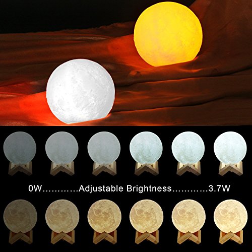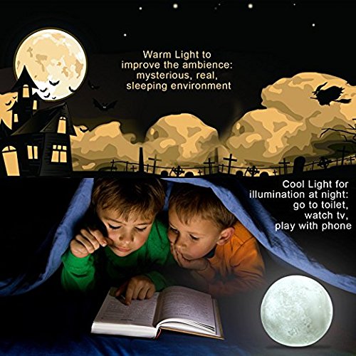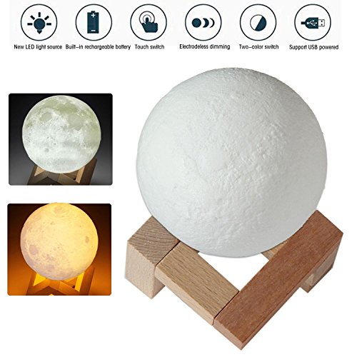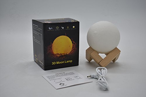-. Feature : 【3D Printing Technology】 The nightstand lamps is delicately crafted with 3D printing technology, restores the real appearance of the moon vividly. The moon has been a divine and enchanting symbol, it brings you lucky and happiness. unique moon shape makes the room full of fun, cute gifts for childrens or baby. / 【Touch Sensor Control and Dual Colors】Give off a comfortable 2700K Warm White and 4000K Neutral White illumination, short touch to turn on/off the moon light and long touch will help you to adjust the brightness. Our 3D print moon light offer you an impressively wide 360 degree beam angle. Touch the control switch within 1 second to switch light color, and touch more than 1 second to adjust the brightness of the light. / 【Rechargeable Night Light】 Smart charge management system, charging time is about 2 hours, fully charged after the automatic stop charging, peace of mind: Soft LED light source, energy saving, long life: Bulit-in rechargeable battery provides 8-12 hours illumination. Standard USB charging port for PC, charger and mobile devices, etc. USB-chargeable for use anytime, anywhere. The cordless table lamps make it easy and covenient for outdoor and home decoration. / 【Good Gift and Decorative Lamp】 A great gift for your friends, kids and families on Christmas, holiday birthday party wedding,or anniversary. A creative decorative night light for home, kids bedroom, living room, dining room, office, college dorm and create a wonderful atmosphere beyond your expectations. / 【Soft Nursey Lamp】 Energy-efficient LED table lamps create a fliker-free and comfortable light. Adjustable lighting color between warm yellow and warm white to creat the ideal sleep environment for your baby and families . A best baby nursey lamp to care eyes and save money.