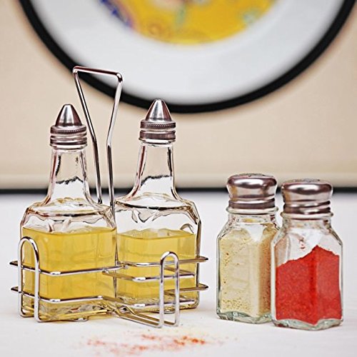 -. Brand : Europe Ware -. Color : Clear -. EAN : 0765857504070 -. Feature : Europe Ware 5 Piece Cruet Set with Rack with 2 Square Salt and Pepper Shakers and 2 Oil and Vinegar Cruets / Keeps condiments together and organized on tabletops.Jars fit securely on caddy. Ideal for home or commercial use. -. Model : JA 0302 -. PackageQuantity : 5 -. ProductGroup : Kitchen -. ProductTypeName : KITCHEN -. Title : Europe Ware 5 Piece Glass & Steel Cruet Set with Rack Oil Vinegar Salt & Pepper -. UPC : 765857504070