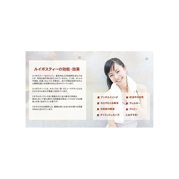 루이 보스에는 항산화물질과 미네랄이 풍부하게 포함되고 있고, 많은 건강 효과가 있기 때문에 매일의 수분 보급에 최적입니다.
