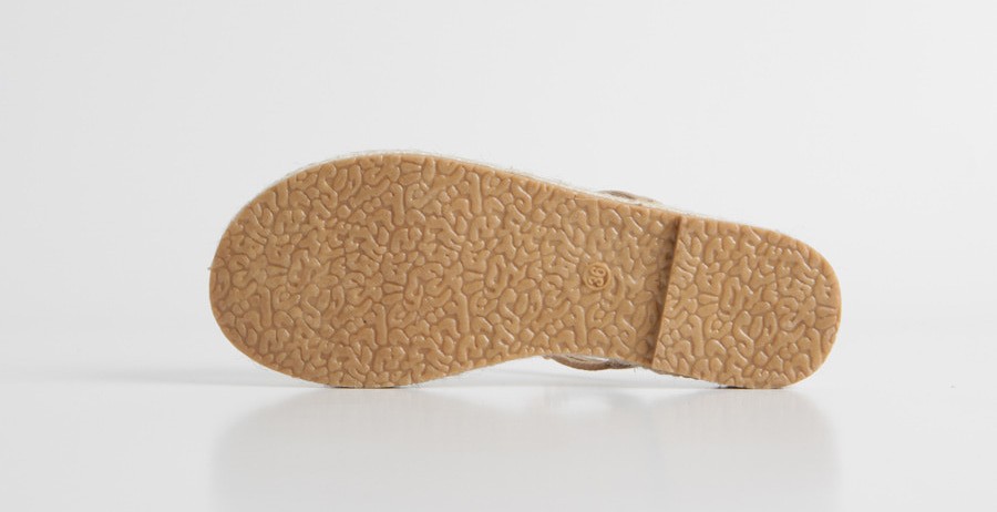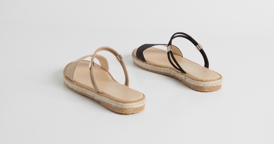 細めのスエード調ベルトに涼しい印象のジュートソールの組み合わせがヌーディーで美しく女性らしい足元を演出。