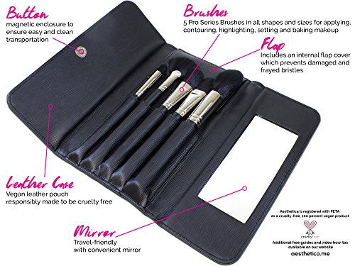 Armed with five fabulous Aesthetica tools - the Powder Foundation and Blending Brush, Cream and Liquid Foundation Brush, Angled Contour Brush, Deluxe Fan Brush, and Small Precision Contour and Concealer Brush - anyone can achieve great coverage and contour & highlight like a pro. With super-soft synthetic bristles and a weighted design, the brushes are all incredibly easy to maneuver through both big picture and detail work. The cosmetic brush set comes with a mirrored vegan leather pouch and is completely cruelty free.