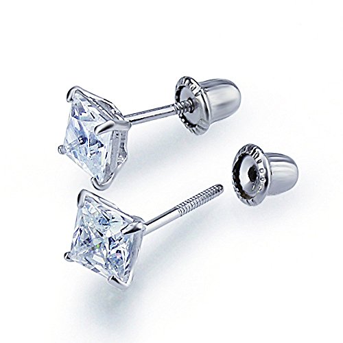 -. Title : 14K White Gold 4mm Square P.R.Incess Cut Cubic Zirconia Basket Set Solitaire Screwback Stud Earrings
