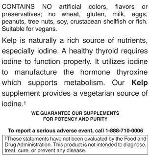 -. Binding : Health and Beauty -. Brand : Natural Nutraceuticals -. Feature : Premium Kelp Algae supplement with Iodine. Highest quality guaranteed. Sourced from natural, clean, clear and non-industrialized waters off the coast of France. Tablets are Vegan, Vegetarian and Double Verified Gluten Free. / Kelp is naturally rich in nutrients, especially Iodine. Iodine supplements thyroid health along with metabolic functions and weight loss. Our amber colored recyclable glass bottles contain best by dates, are environmentally friendly, and guarantee freshness. Full body, tamper-evident sleeves ensure consumer safety. / Natural Nutraceuticals supports the Vitamin Angels Foundation, Friend of the Sea Organization, Fair Trade Organization, and Natural Products Association. We are committed to environmental sustainability and social responsibility. / Our supplier is the best in the business. Located in the USA with the following qualifications: GMP Certified, Friend of the Sea, Fair Trade Certified, USDA Organic, Double Verified Gluten Free, recent recipient of the Diamond Manufacturing Award and a contributing member to the Vitamin Angels Foundation. / Natural Nutraceuticals offers free shipping on orders of $35 or more. No questions asked, 30-day money back guarantee. Click the 'add to cart' button to experience the best Kelp Algae supplement available. -. Label : Natural Nutraceuticals -. Manufacturer : Natural Nutraceuticals -. MPN : 0614010000 -. PackageQuantity : 1 -. PartNumber : 0614010000 -. ProductGroup : Health and Beauty -. ProductTypeName : HEALTH_PERSONAL_CARE -. Publisher : Natural Nutraceuticals -. Studio : Natural Nutraceuticals -. Title : Natural Nutra - Premium Kelp Algae Supplement - Highest Source of Iodine - Natural, Clean, Clear, Non-Industrialized Source - Supports Healthy Thyroid, Metabolism, and Weight Loss - Gluten Free - Vegan - Vegetarian - 100 Tablets