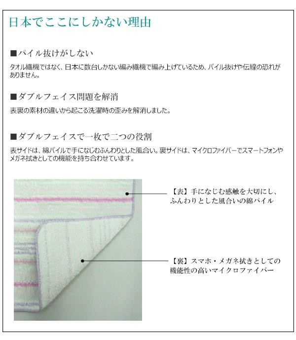 両面の素材が異なり、二つの役割を果たします。表面は普通のタオルハンカチとして、手を拭いたり汗を拭ったり。裏面は超極細繊維により、メガネやスマートフォン拭きとして皮脂汚れを取り除いてくれます。 |