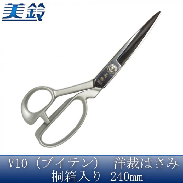 | 武生特殊鋼材製の刃物鋼V金10号を使用した裁ちばさみ。 |