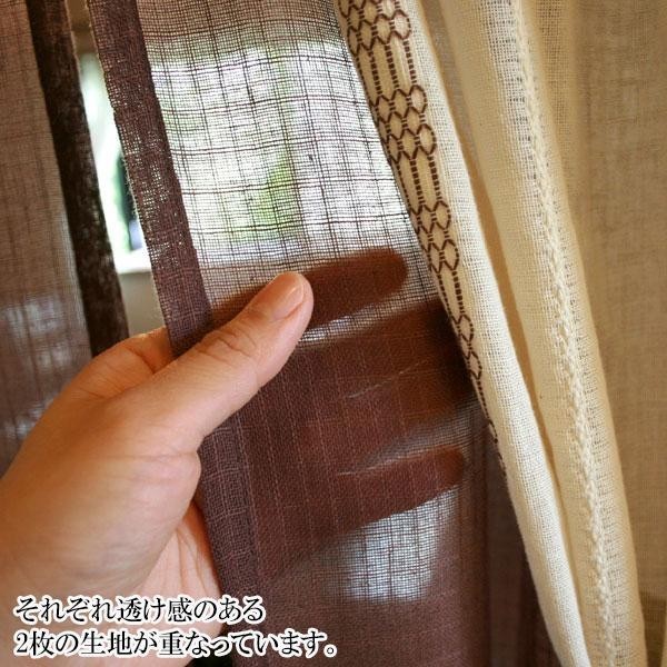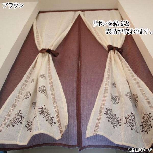お手持ちのポール(つっぱり棒)にかけてお使いいただくタイプです。それぞれ透け感のある2枚の生地が重なっているので、リボンの使い方でデザインも変化します。 製造国:インド 素材・材質:綿100% 商品サイズ:幅85cm×丈150cm 仕様:手洗い可 ※サプライヤー直送品  ご注文後3~4営業日後の出荷となります【商品名】コットン2重のれん 暖簾 リノ 幅85cm×丈150cm BR・ブラウン
