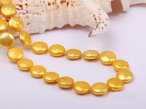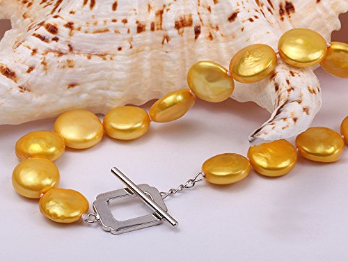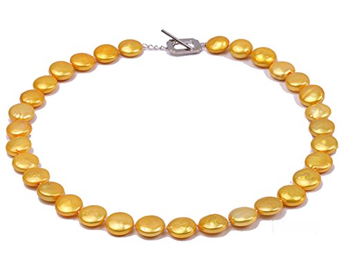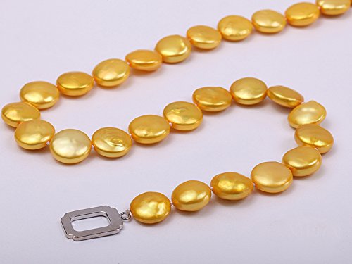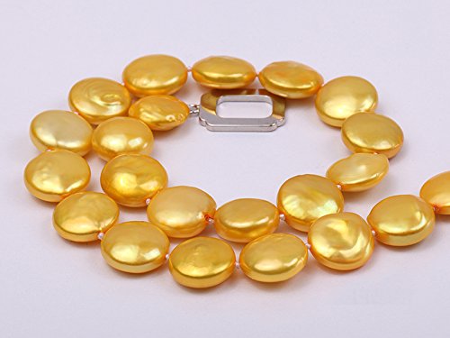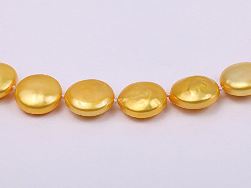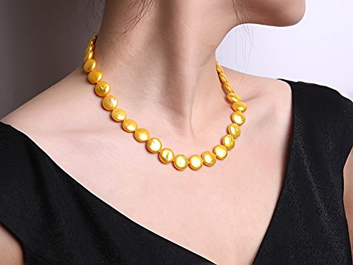 Description *Beautiful single-strand Necklace made of 12-13mm yellow button-shaped cultured freshwater pearls.