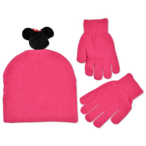 - Pink beanie hat and matching glove set are 100% acrylic, exclusive of decoration. Hat features 3D Minnie Mouse head on top and sublimated character artwork on the front. Matching pink knit gloves feature Minnie Mouse character artwork