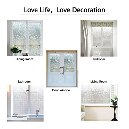 About Our 3D Mosaic Window Film: 1--Adopt static cling technology No-glue. Easy to fix and remove without any traces left. 2--Elegant mosaic pattern Colorful prism effect. Looks really amazing when the light hits it. 3--Made from high quality PVC Environmental protection. No harmful chemicals. 4--Totally Reusable Repeatedly cling. it can be reused even after several years. 5--Satisfy your DIY need Shape it for bookcase, tea table, cupboard, glass vase, fishbowl and so on. 6--Provide great privacy Block 96% of UV ray but still let in the light. Bring Health to your family! 7--Get plenty of compliments Transform your living space more unique at the minimum amount of work and cost.
