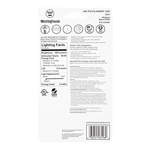 Westinghouse 0319620 40W Equivalent F15 Dimmable Amber Filament LED Light Bulbs with Medium Base (4 Pack)