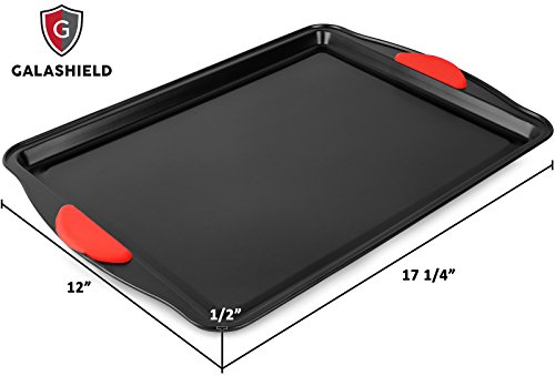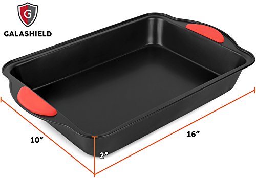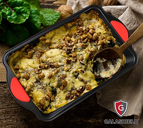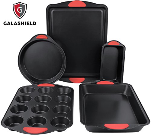 The 'Galashield Bakeware Set' offers 5 must-have baking pans. A great set for all your baking needs. These bakeware pans are made of durable carbon steel that resists warping and feature long-lasting nonstick coating that provides excellent food release and easy cleanup. With this 5-piece set you get everything you need, from roasting stuffed eggplant, broiling cheesy garlic bread, baking your favorite muffins, or baking yummy chocolate chip cookies. The baking pans' bold-colored, extra-wide grippy silicone handles provide a confident grasp when pulling items from the oven and they are oven safe up to 425° F. Hand wash only for best cooking performance and to preserve the nonstick coating. Includes the following pans: 9" round pan15" x 11.5" cookie sheet9" x 13" baking panstandard 12-Cup muffin pan9" x 5" loaf pan 0 |