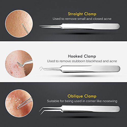 - 【BLACKHEAD REMOVAL KIT】: 5 pieces includes 3 tweezers with different sizes and 2 extractors with triangular loop and acne needle, easy to remove impurities such as blemish, acne, blackhead, pimple, etc